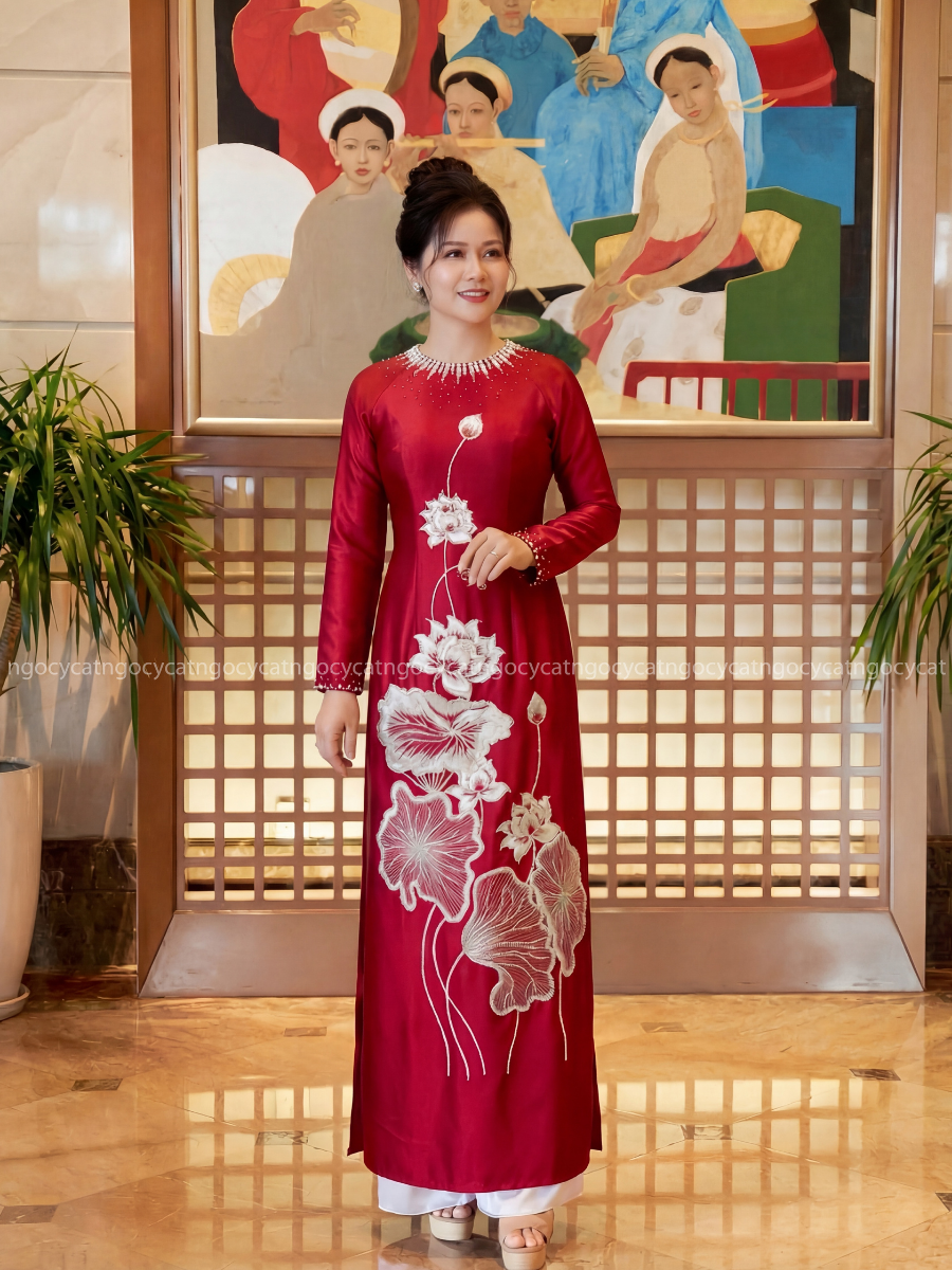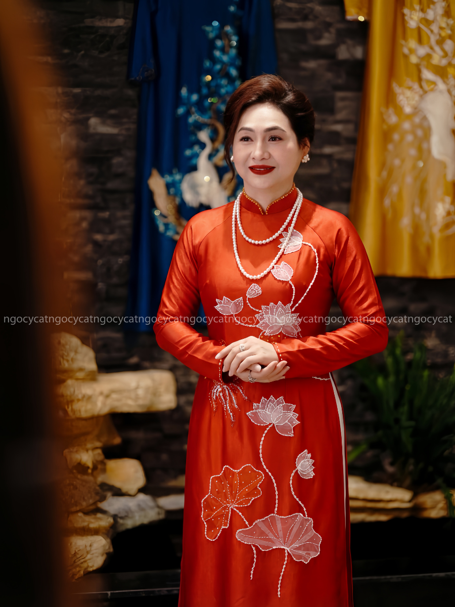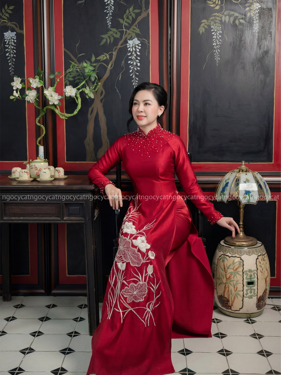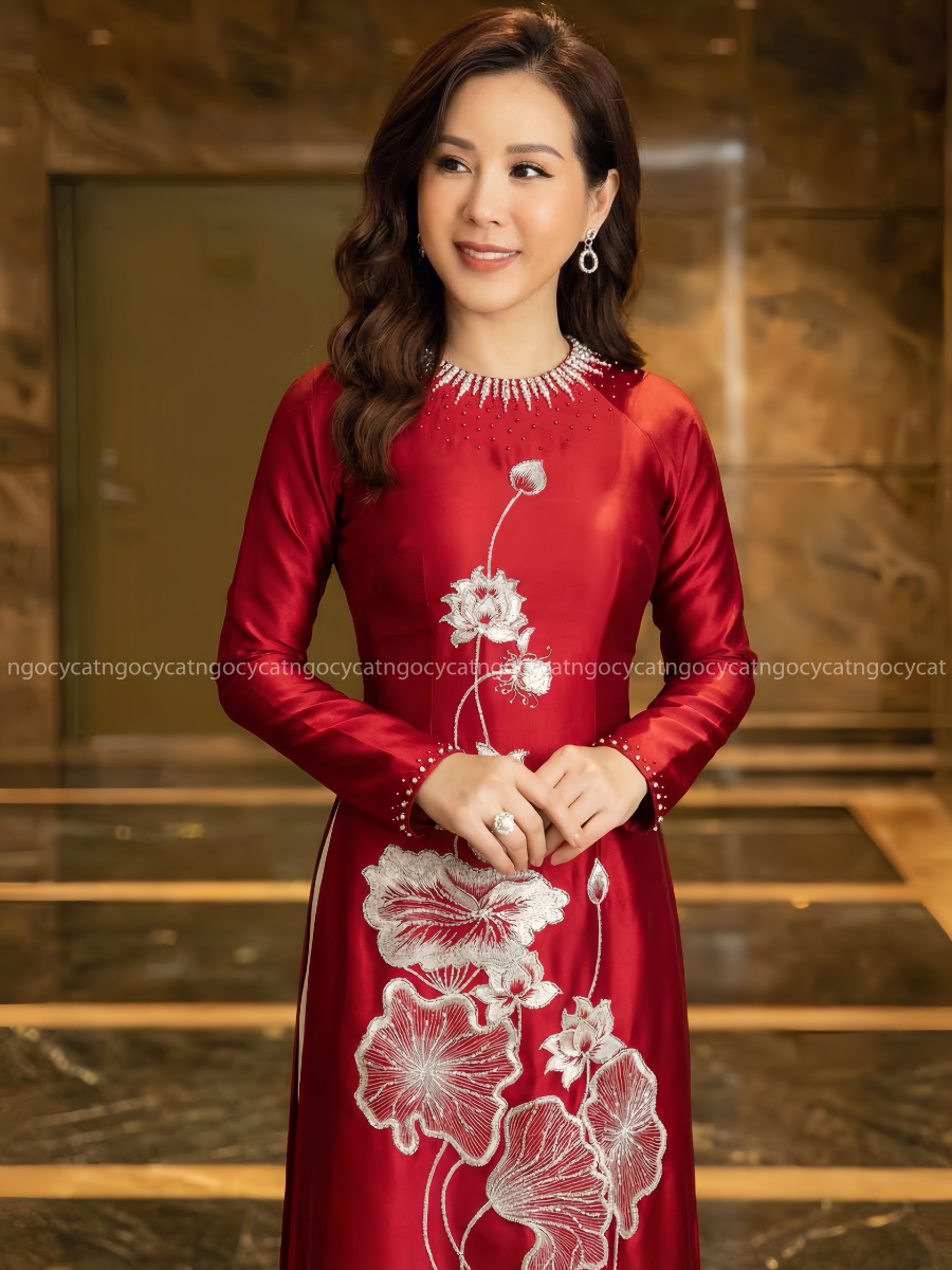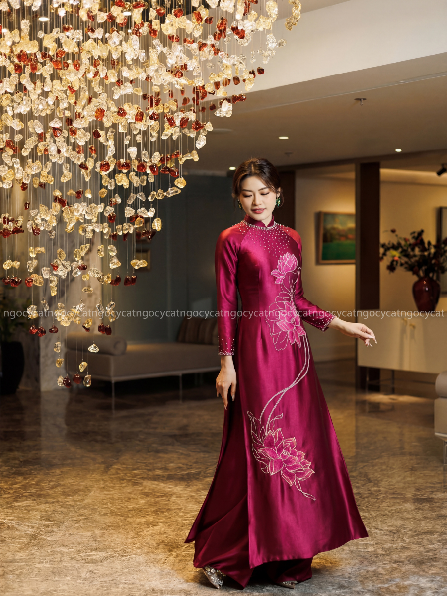 Áo dài nhung mang đến vẻ đẹp cổ điển và sang trọng. Chất liệu nhung mềm mại, có độ bóng nhẹ giúp bộ trang phục trở nên nổi bật hơn dưới ánh sáng của buổi lễ.
