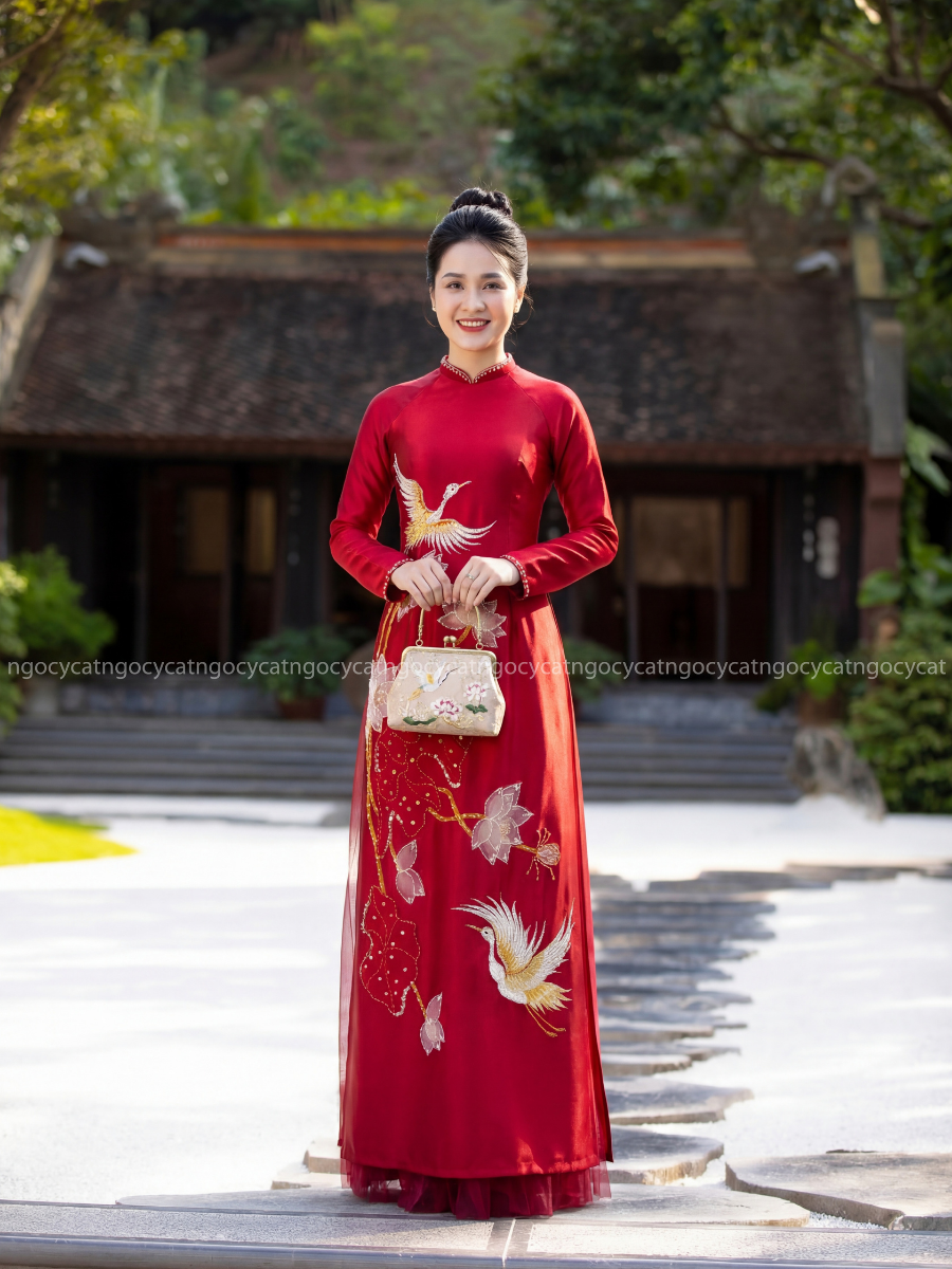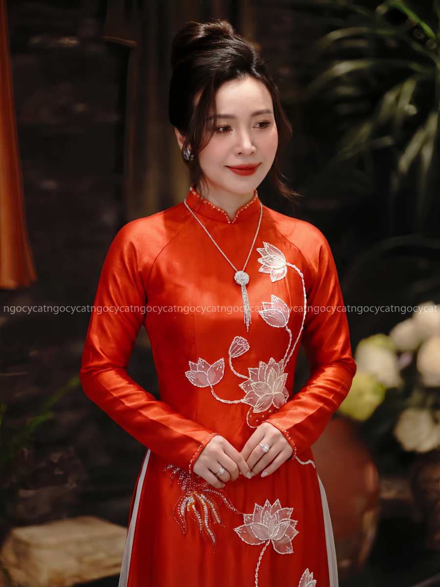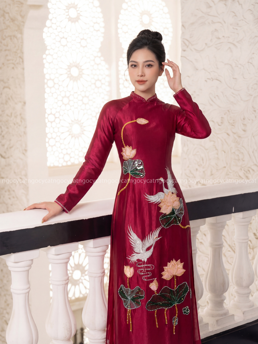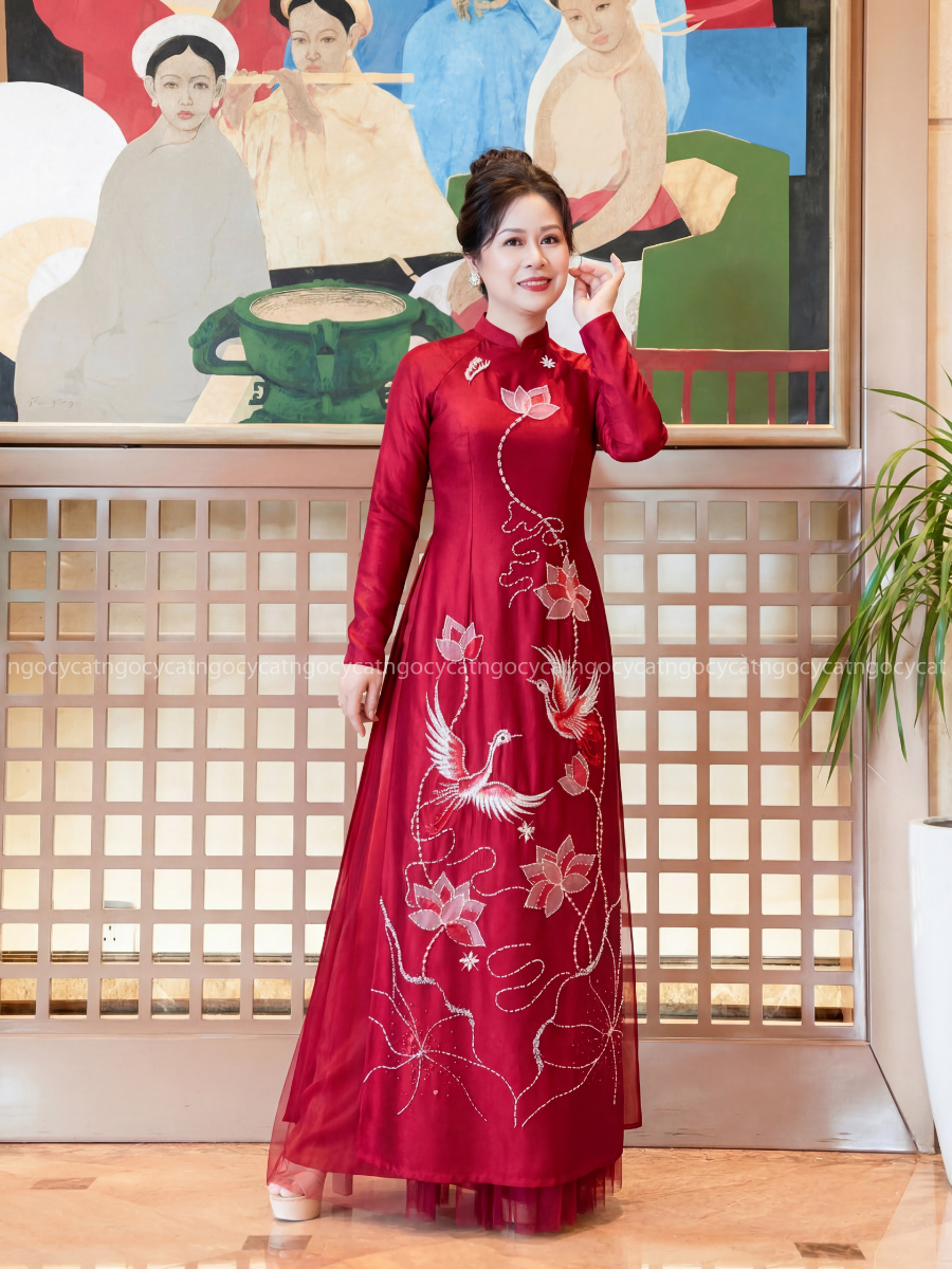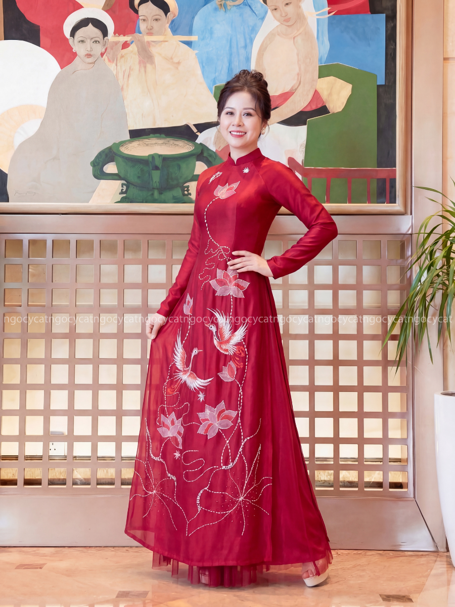 Áo dài nhung mang đến vẻ đẹp cổ điển và sang trọng. Chất liệu nhung mềm mại, có độ bóng nhẹ giúp bộ trang phục trở nên nổi bật hơn dưới ánh sáng của buổi lễ.