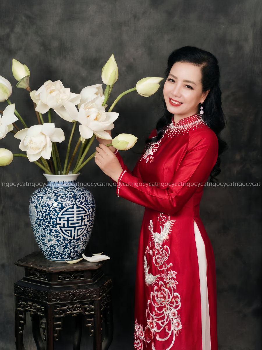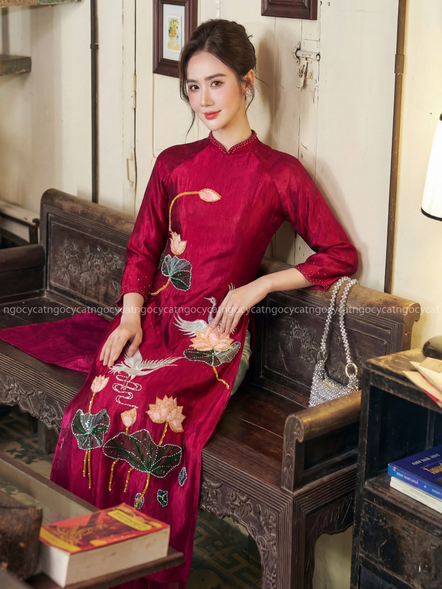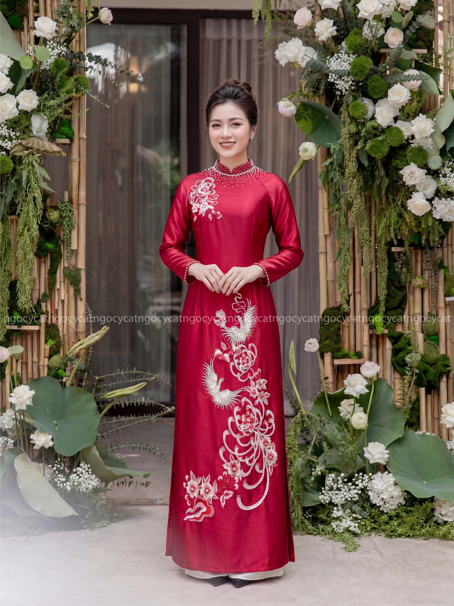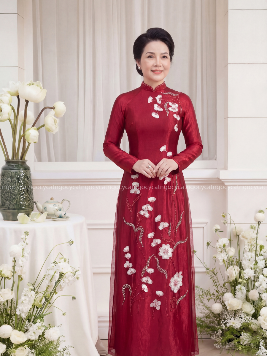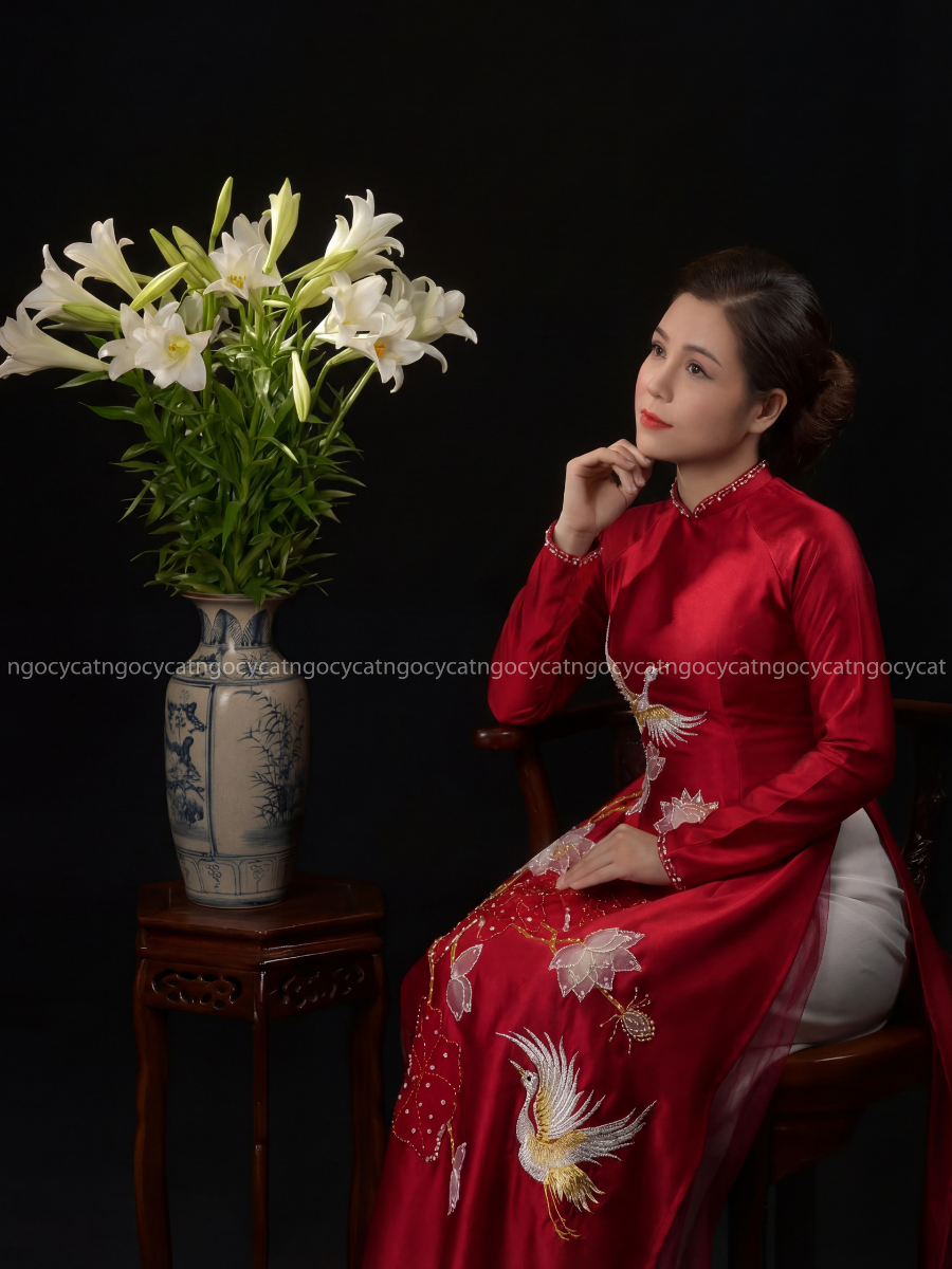 Áo dài nhung mang đến vẻ đẹp cổ điển và sang trọng. Chất liệu nhung mềm mại, có độ bóng nhẹ giúp bộ trang phục trở nên nổi bật hơn dưới ánh sáng của buổi lễ.