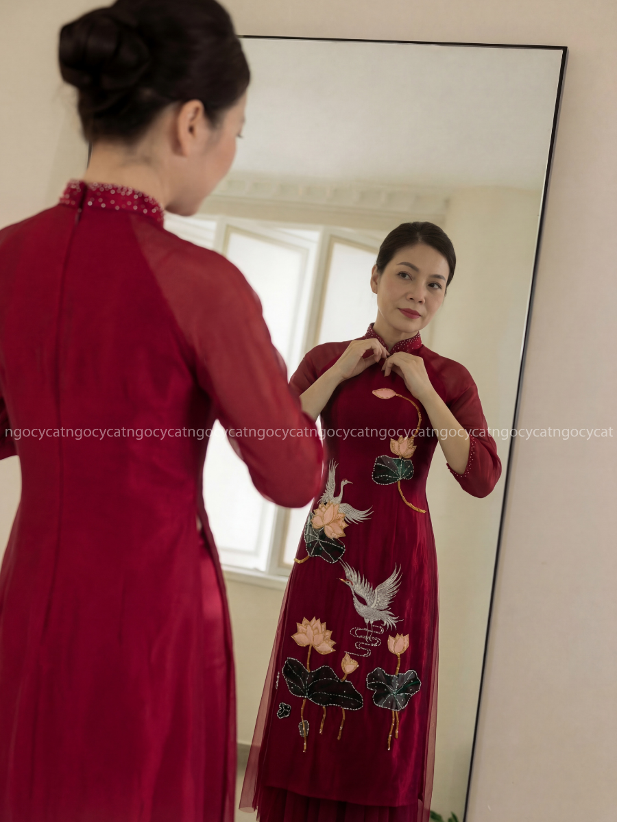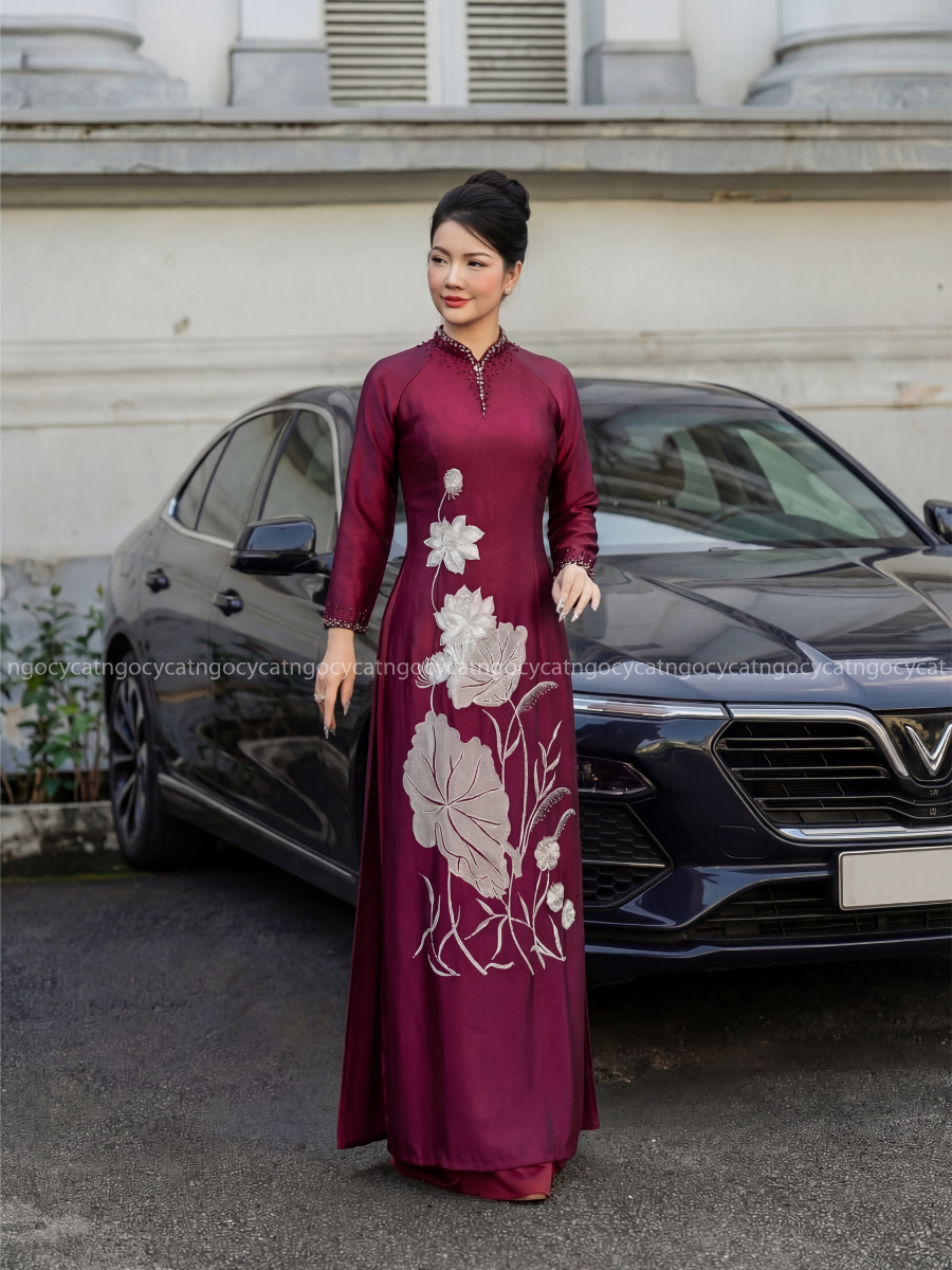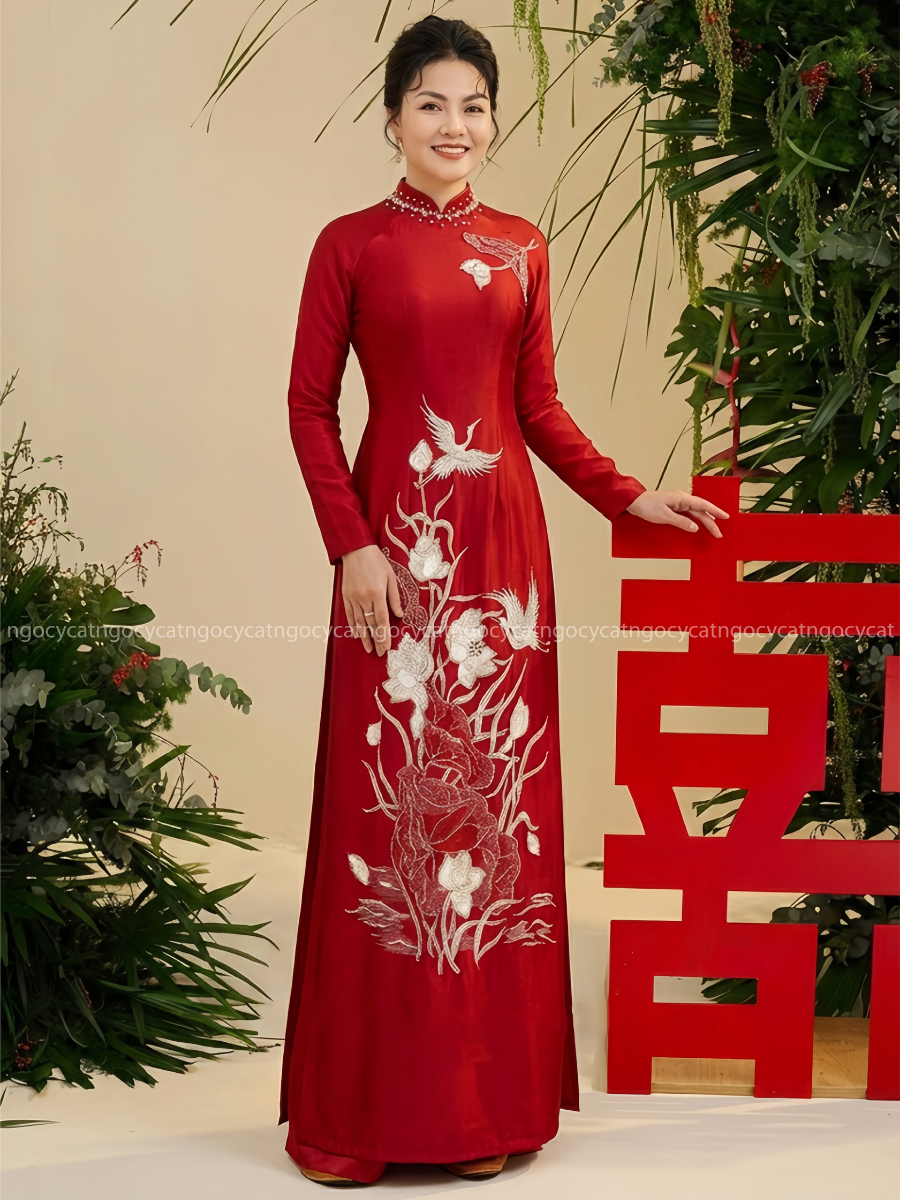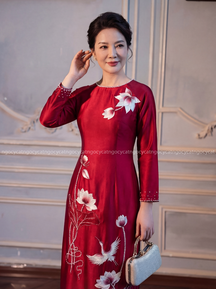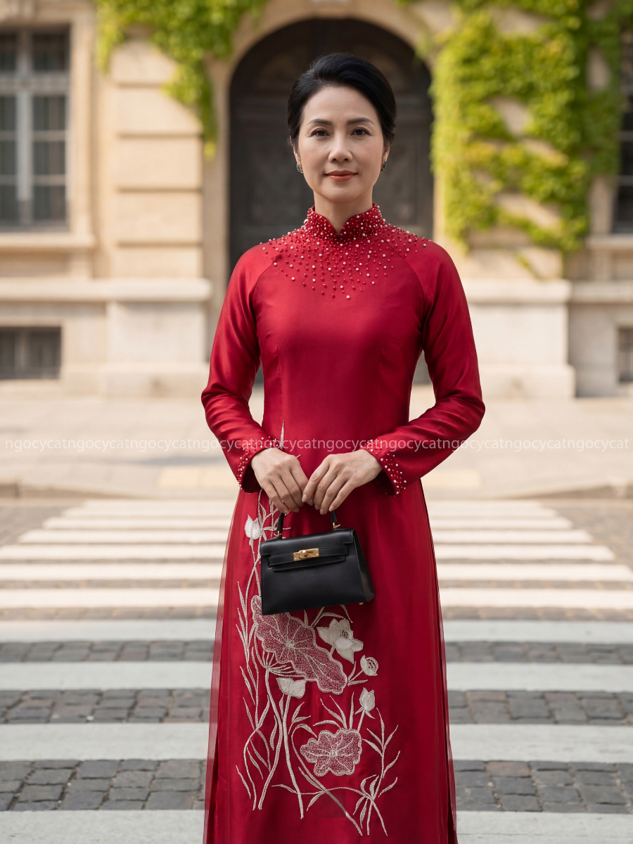 Áo dài nhung mang đến vẻ đẹp cổ điển và sang trọng. Chất liệu nhung mềm mại, có độ bóng nhẹ giúp bộ trang phục trở nên nổi bật hơn dưới ánh sáng của buổi lễ.