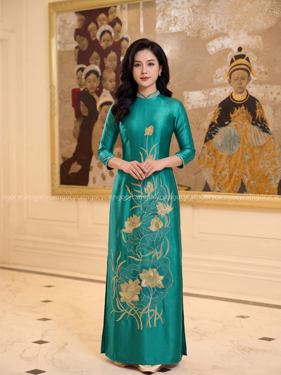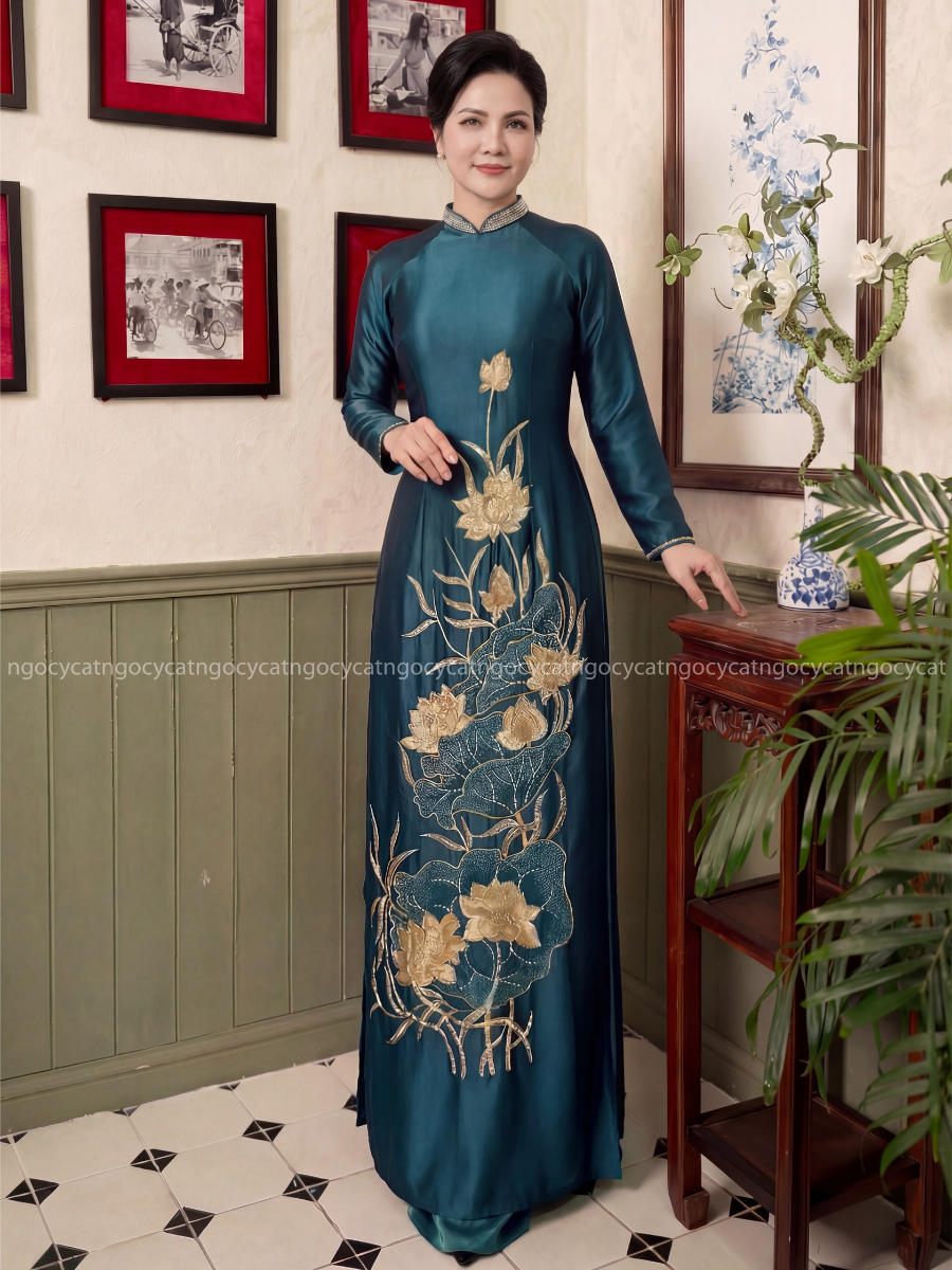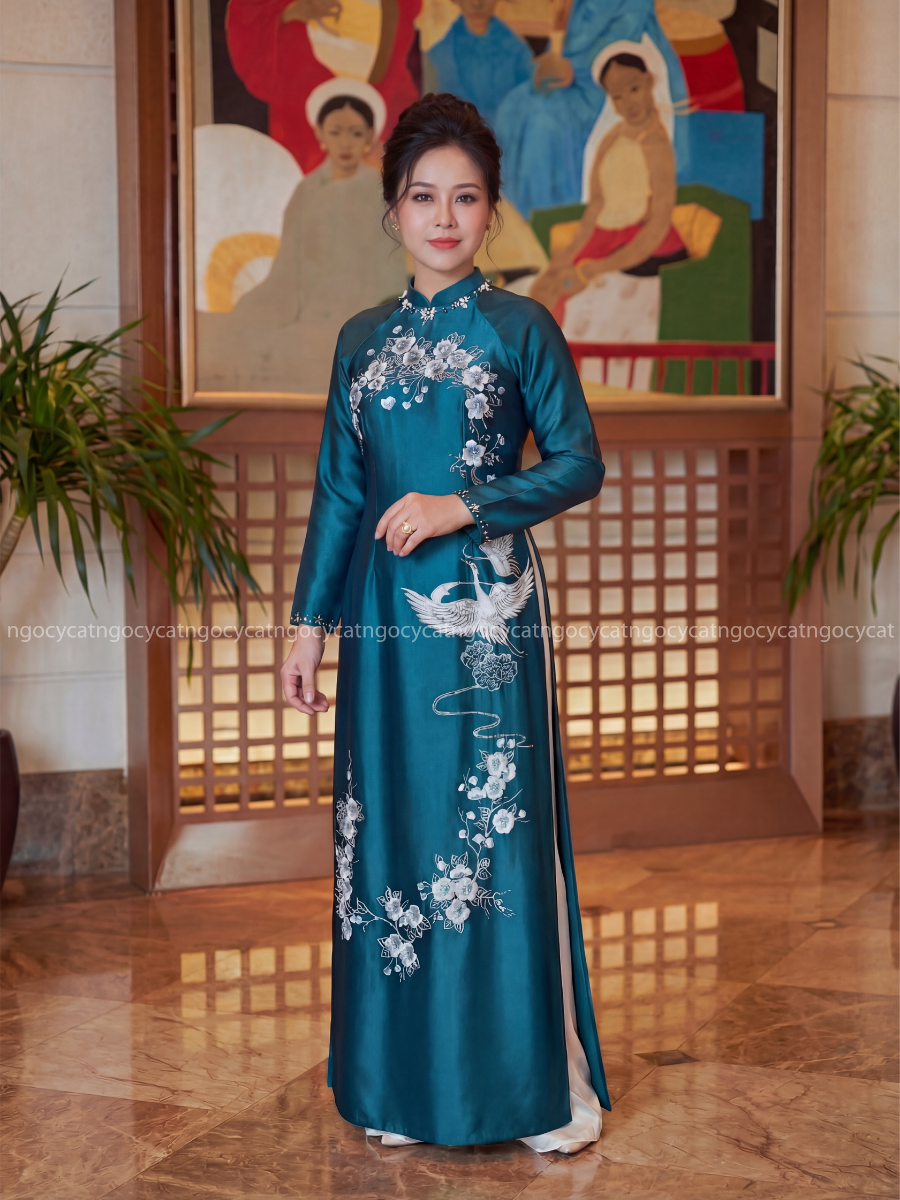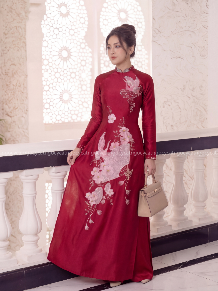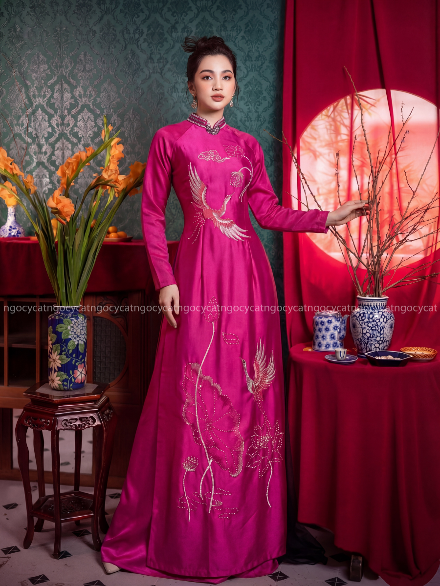 Áo dài nhung mang đến vẻ đẹp cổ điển và sang trọng. Chất liệu nhung mềm mại, có độ bóng nhẹ giúp bộ trang phục trở nên nổi bật hơn dưới ánh sáng của buổi lễ.