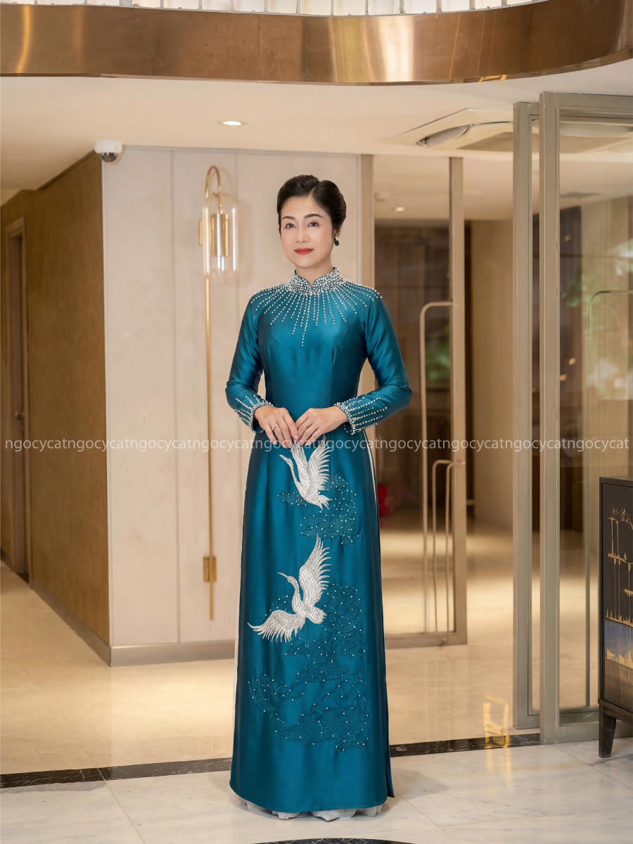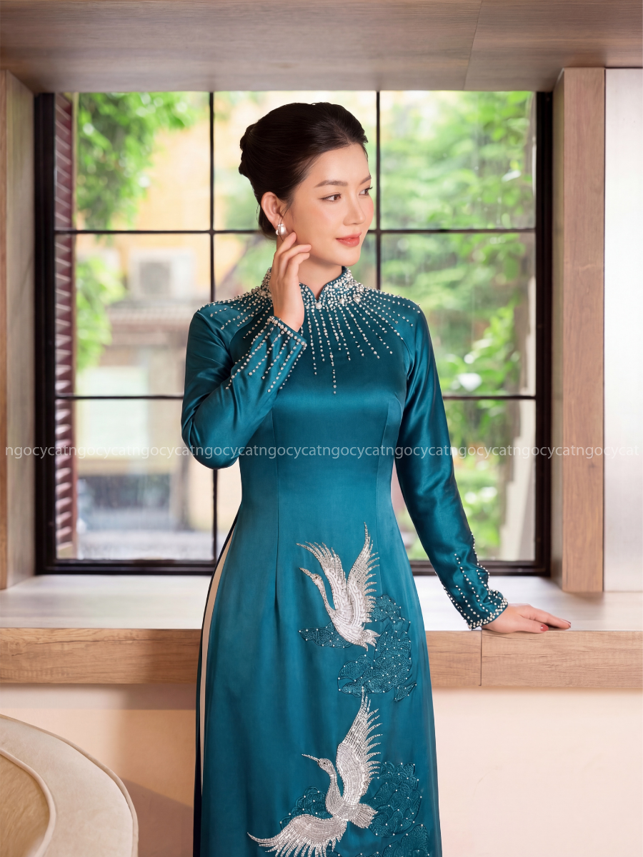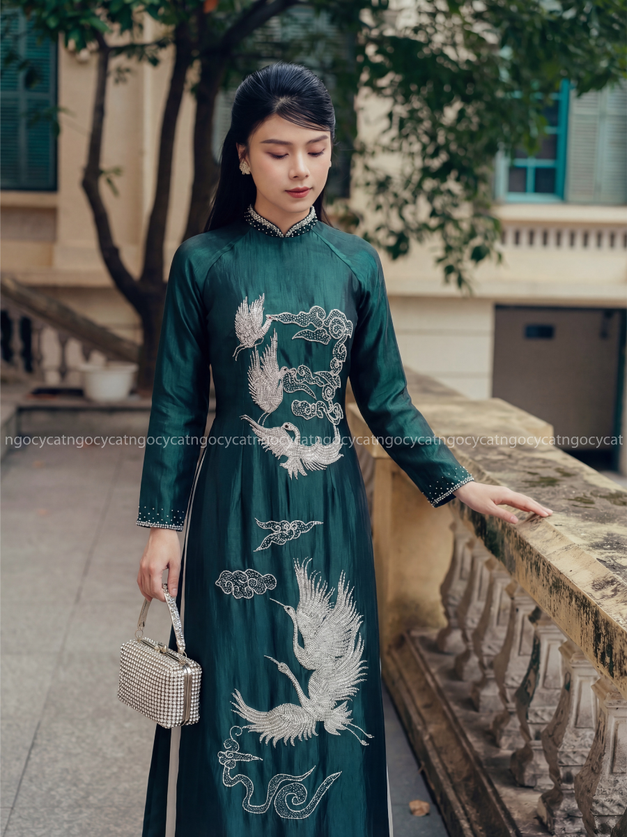 Áo dài đính đá là lựa chọn hoàn hảo cho những bà sui muốn nổi bật trong ngày cưới. Các chi tiết đính đá thường được thực hiện tinh tế ở phần cổ áo, tay áo hoặc thân áo để tạo điểm nhấn.